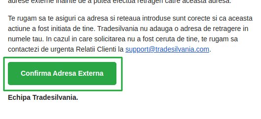Look for the email with the title Tradesilvania – Confirm external address and press the button in the email with the name Confirm External Address.