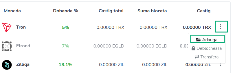 2. From the table, next to the coins you want to add to Savings, click on the 3 dots and press the Add button