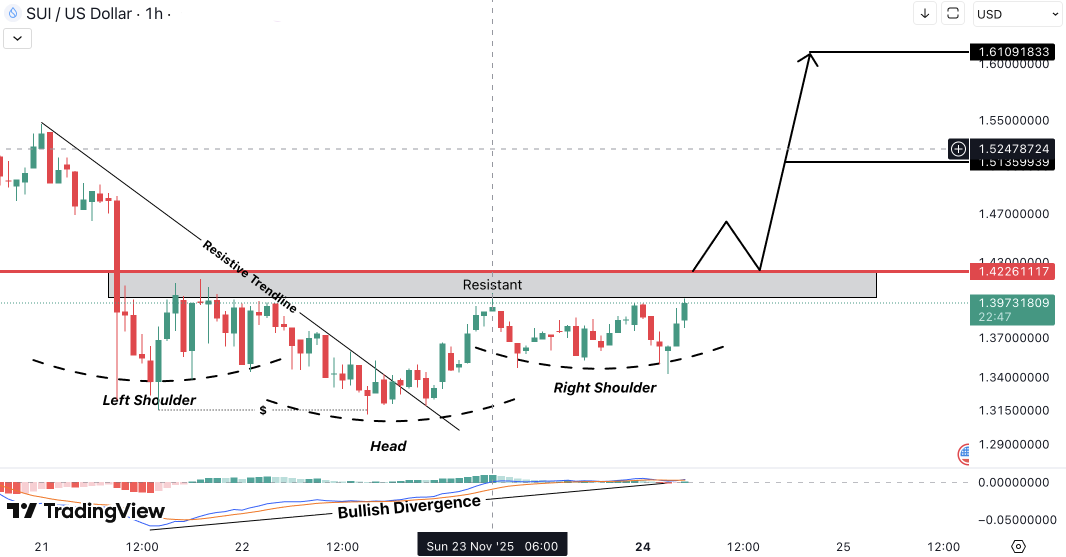 SUI has broken out of the resistive trendline and formed an inverse head and shoulders pattern with bullish divergence, which increases the probability of a bullish move. For confirmation, we need a breakout and candle closing above the resistance zone of 1.42 USD. Once the price closes above this level, we can expect targets at 1.51 USD and 1.61 USD.