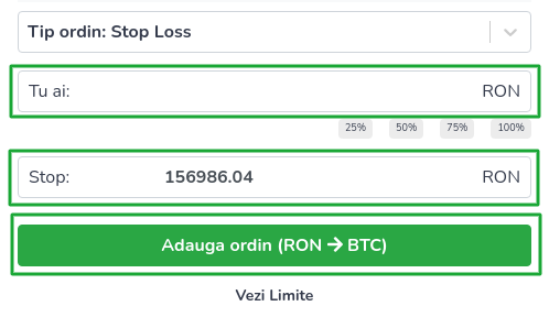 - exemplu: pretul curent din piata este 50.000 EURO pentru 1 BTC. Daca dvs doriti sa preveniti o pierdere potentiala puteti seta un STOP la 40.000 EURO pentru 0.5 BTC. Daca pretul scade la 40.000 EURO pentru 1 BTC, ordinul stop loss de vanzare va fi executat (se efectueaza vanzarea a 0.5 BTC).