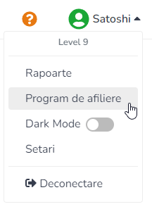 Pentru a vizualiza suma castigata trebuie sa mergi in sectiunea Setari (in partea dreapta a ecranului, click pe numele tau) sau click pe Numele Tau si apoi pe butonul „Program de afiliere”.