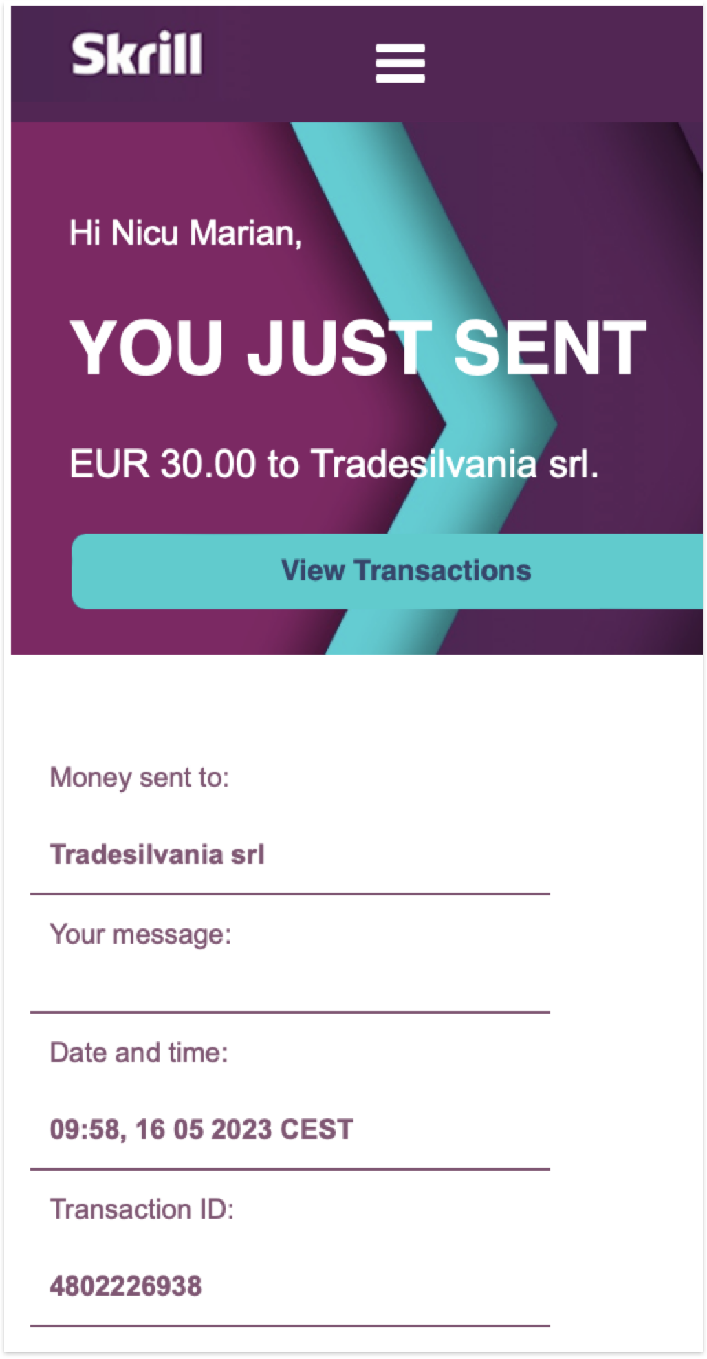 11. In platforma Tradesilvania apare un mesaj de confirmare a platii Skrill
