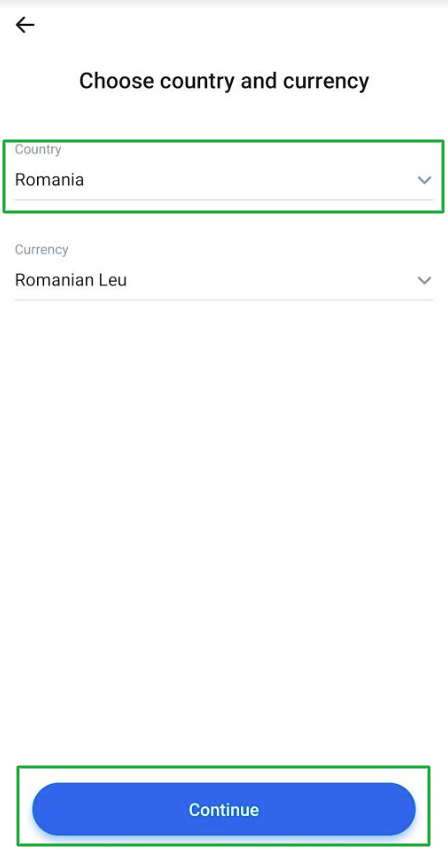 12. Selecteaza la Country Romania si ca moneda Romanian Leu, daca depunerea se face in RON, iar daca depunerea se face în EURO, selecteaza  Lituania la Country si EURO ca moneda.